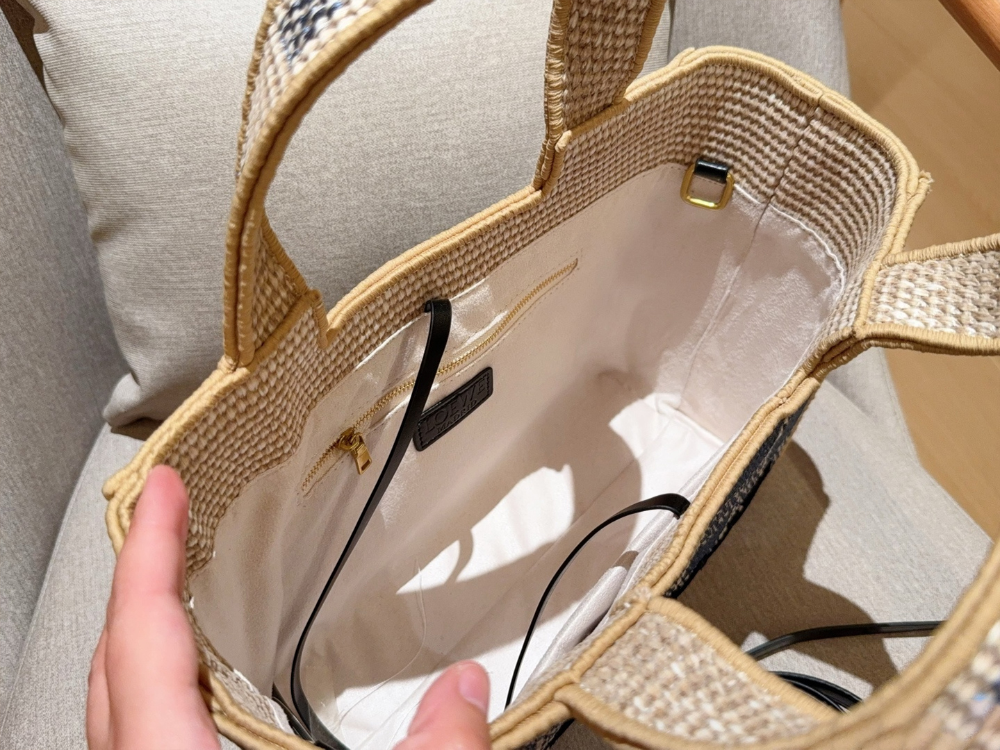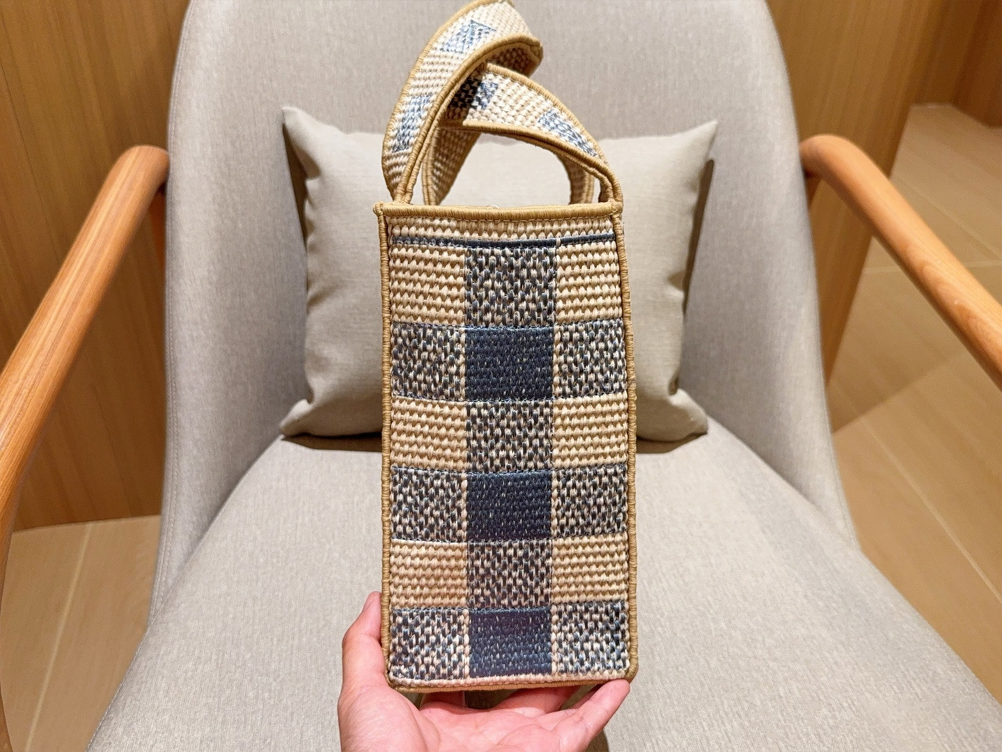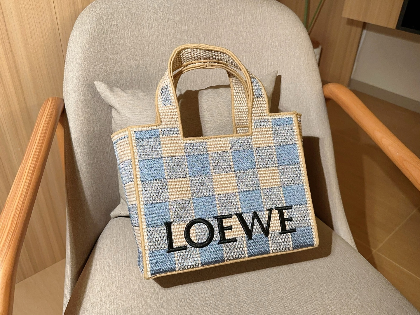 LoeweWoven bag is here 🔆Blue-and-white checkered embroidered-logo straw basket tote bagCrossbody availableDimensions: 30×24×13 cm
